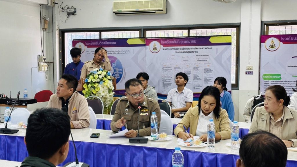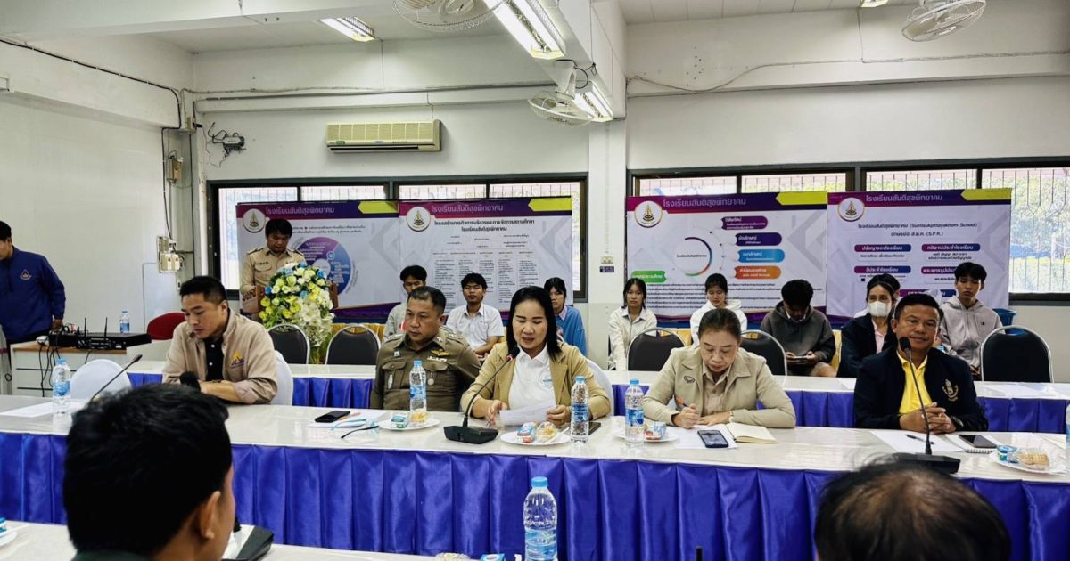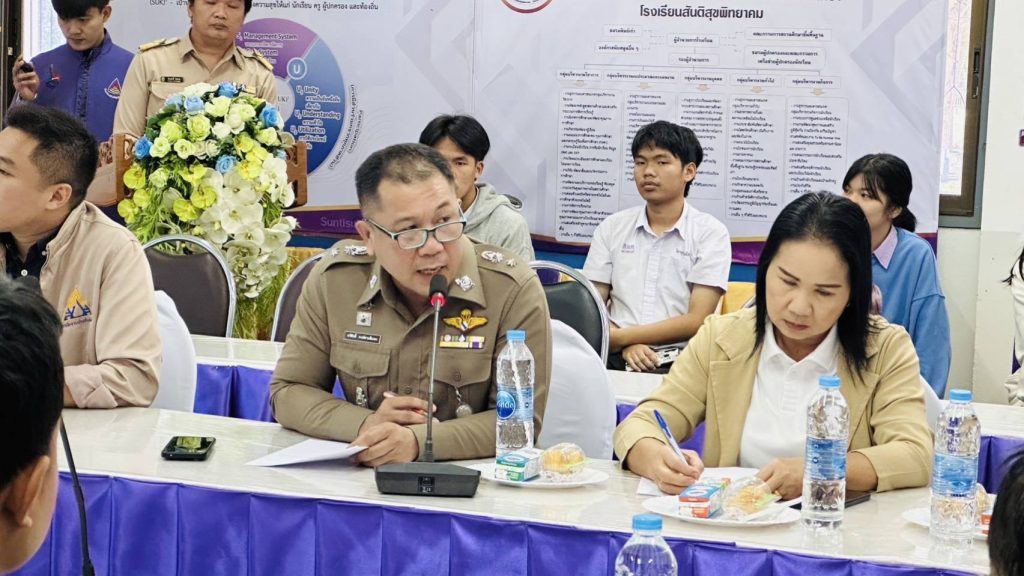 วันที่ 20 พฤศจิกายน 2566 เวลา 08.30 น.โดยการอำนวยการของ พ.ต.อ.สมชาย กาวิเนตร ผกก.สภ.สันติสุข มอบหมายให้ พ.ต.ท.ทวีศักดิ์ หงษ์สามสิบหก สวป.สภ.สันติสุข และ คุณวราภรณ์ บุญศัพท์ ประธาน กต.ตร.สภ.สันติสุข ร่วมประชุมเพื่อสร้างความร่วมมือระหว่างโรงเรียน ชุมชน และหน่วยงานราชการที่เกี่ยวข้อง ในการสร้างมาตรการทางสังคมเพื่อป้องกันและแก้ไขพฤติกรรมทางสังคมของเยาวชนที่ไม่เหมาะสม อันส่งผลกระทบที่จะก่อให้เกิดความเสื่อมเสียในวงกว้าง ณ ห้องประชุม อินทนิล รร.สันติสุขพิทยาคม