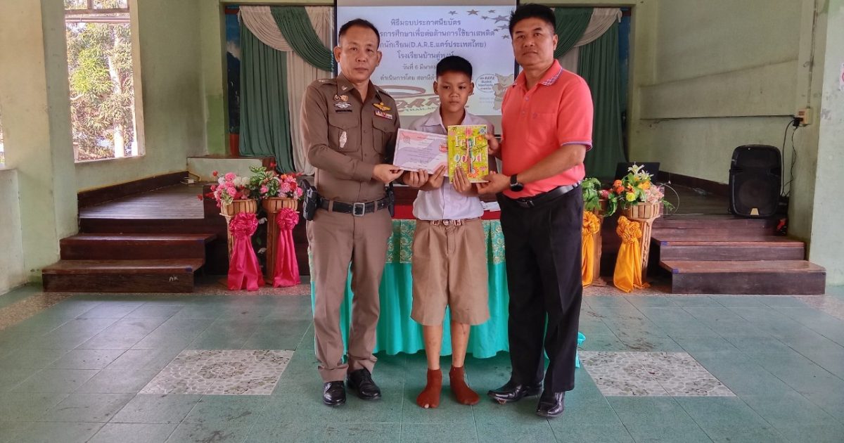 สภ.สันติสุข จว.น่าน  วันที่ 11 มีนาคม 2568 เวลา 09.00 น. โดยการอำนวยการของ พ.ต.อ.สมชาย กาวิเนตร ผกก.สภ.สันติสุข ฯ พ.ต.ท.กรัยฉัตร อินต๊ะพันธ์ รอง ผกก.ป.สภ.สันติสุขฯ มอบหมายให้ พ.ต.ต.สมพงษ์ ยั่งยืน สวป.สภ.สันติสุข เป็นประธานในพิธีมอบใบประกาศนียบัตรให้กับนักเรียนผู้สำเร็จการศึกษา โครงการการศึกษาเพื่อต่อต้านการใช้ยาเสพติดในเด็กนักเรียน(D.A.R.E.ประเทศไทย) ประจำปีการศึกษา 2567 ณ ห้องประชุมโรงเรียนบ้านดู่พงษ์ ต.ดู่พงษ์ อ.สันติสุข โดยได้รับความร่วมมือจาก ผู้อำนวยการโรงเรียนฯ คณะครู และนักเรียนเป็นอย่างดี