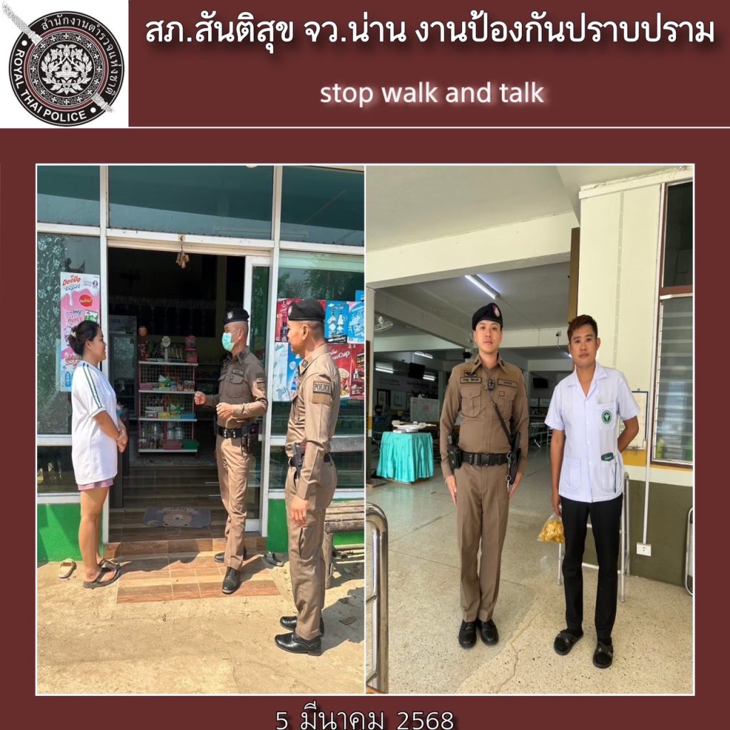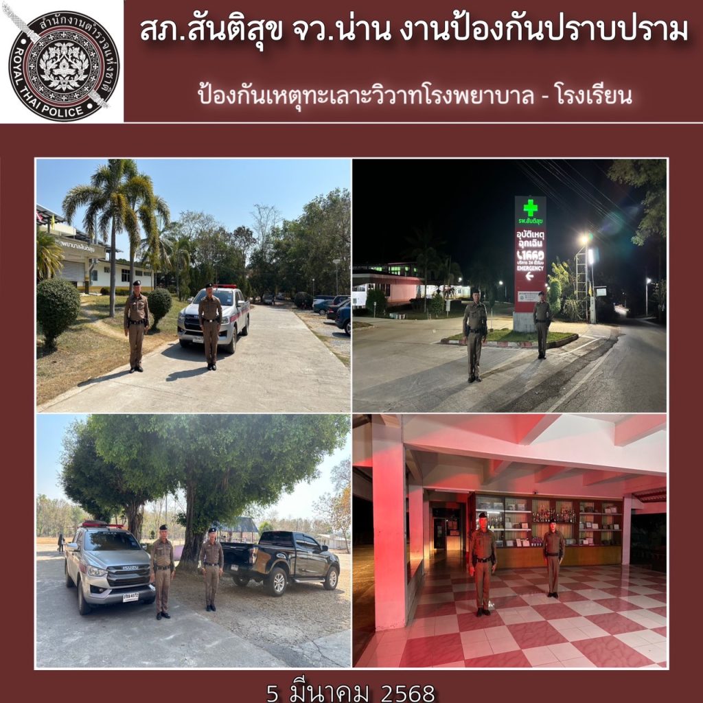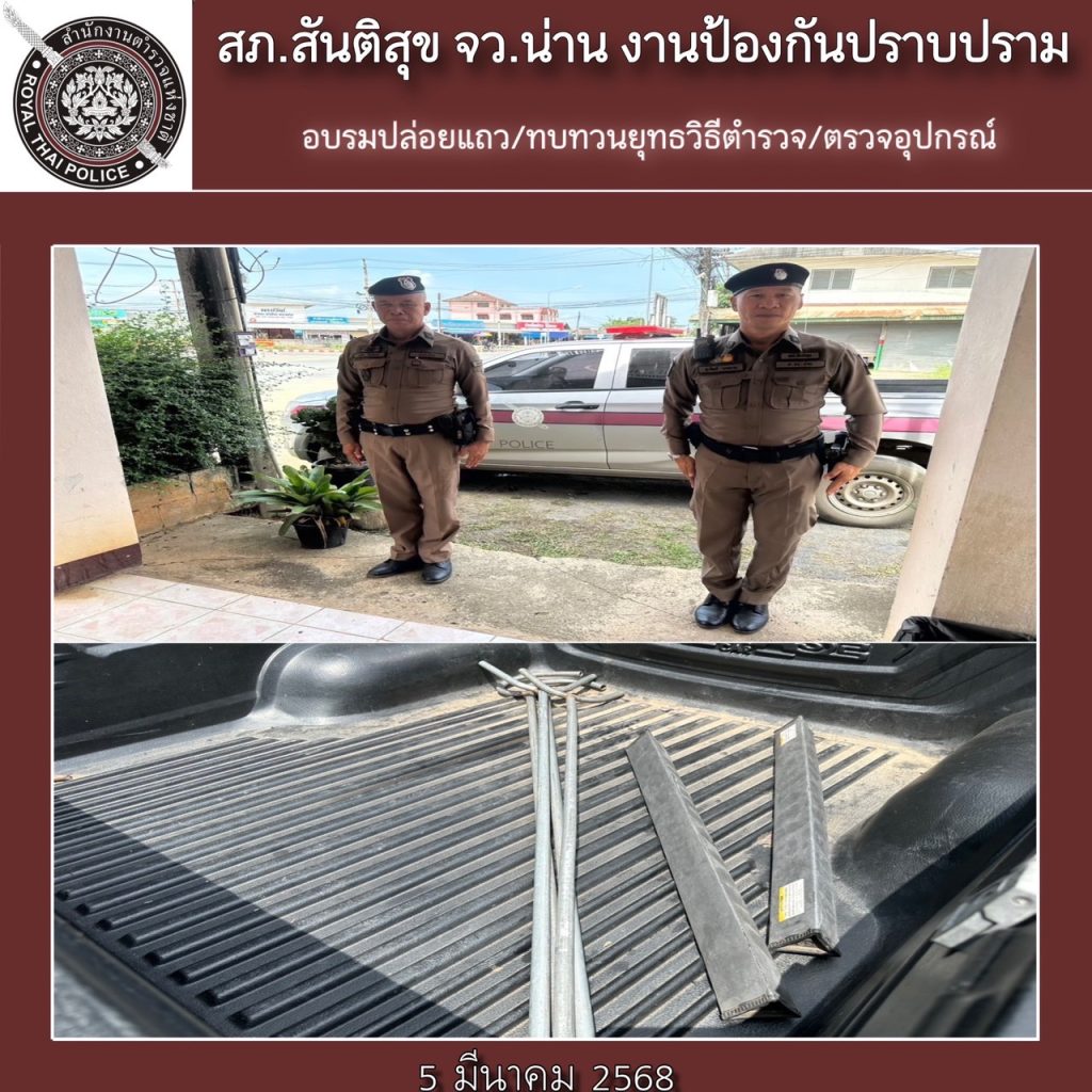 สภ.สันติสุข ภ.จว.น่าน วันที่ 5 มีนาคม 2568 โดยการอำนวยการของ พ.ต.อ.สมชาย กาวิเนตร ผกก.สภ.สันติสุขฯ, พ.ต.ท.กรัยฉัตร อินต๊ะพันธ์ รอง ผกก.ป.ฯ ,พ.ต.ต.สมพงษ์ ยั่งยืน สวป.ฯ ได้สั่งการให้ ร.ต.อ.อุทัย รินอินทร์ รอง สวป.ฯ/ปฏิบัติหน้าที่ร้อยเวรป้องกันปราบปราม(ร้อยเวร 20) พร้อมพวก