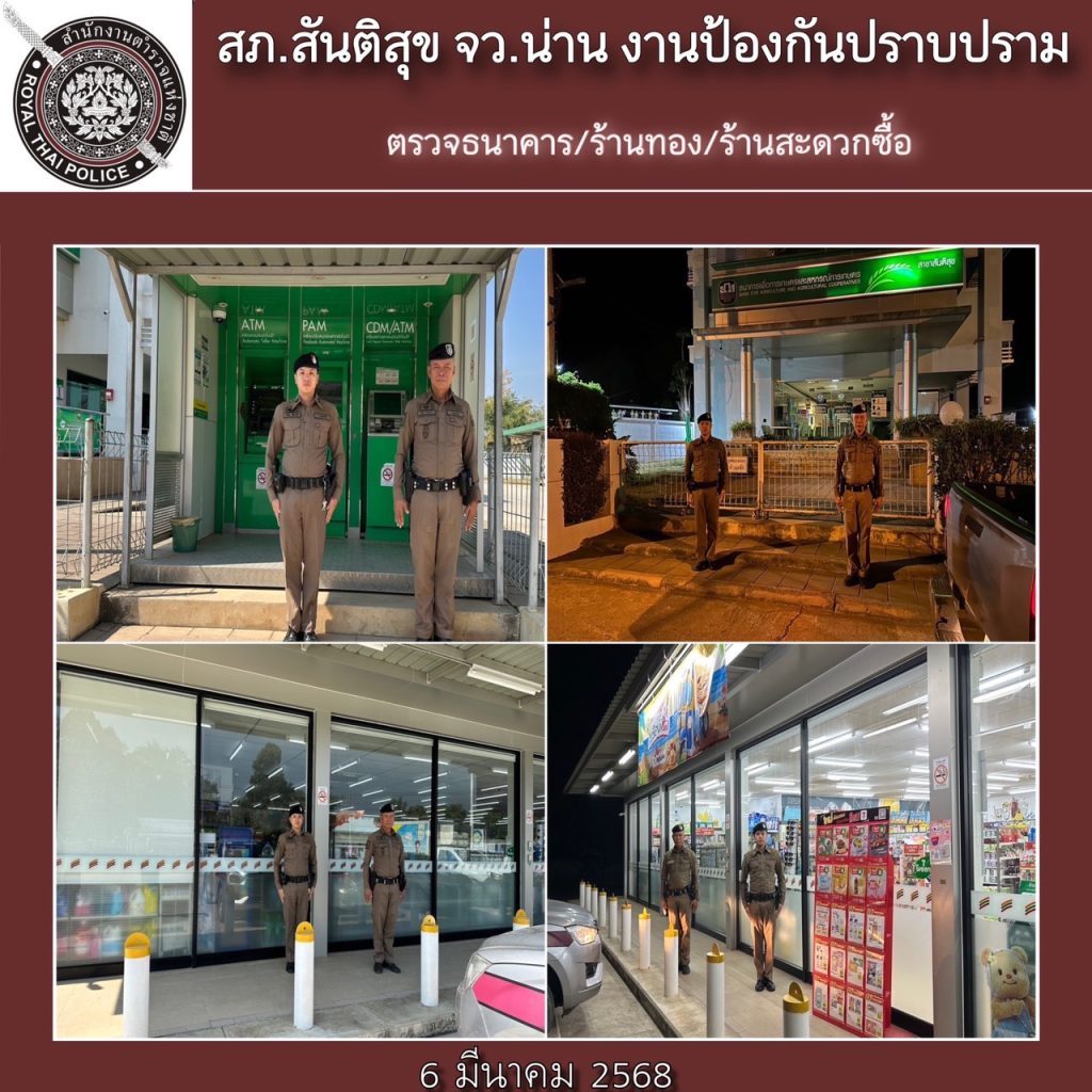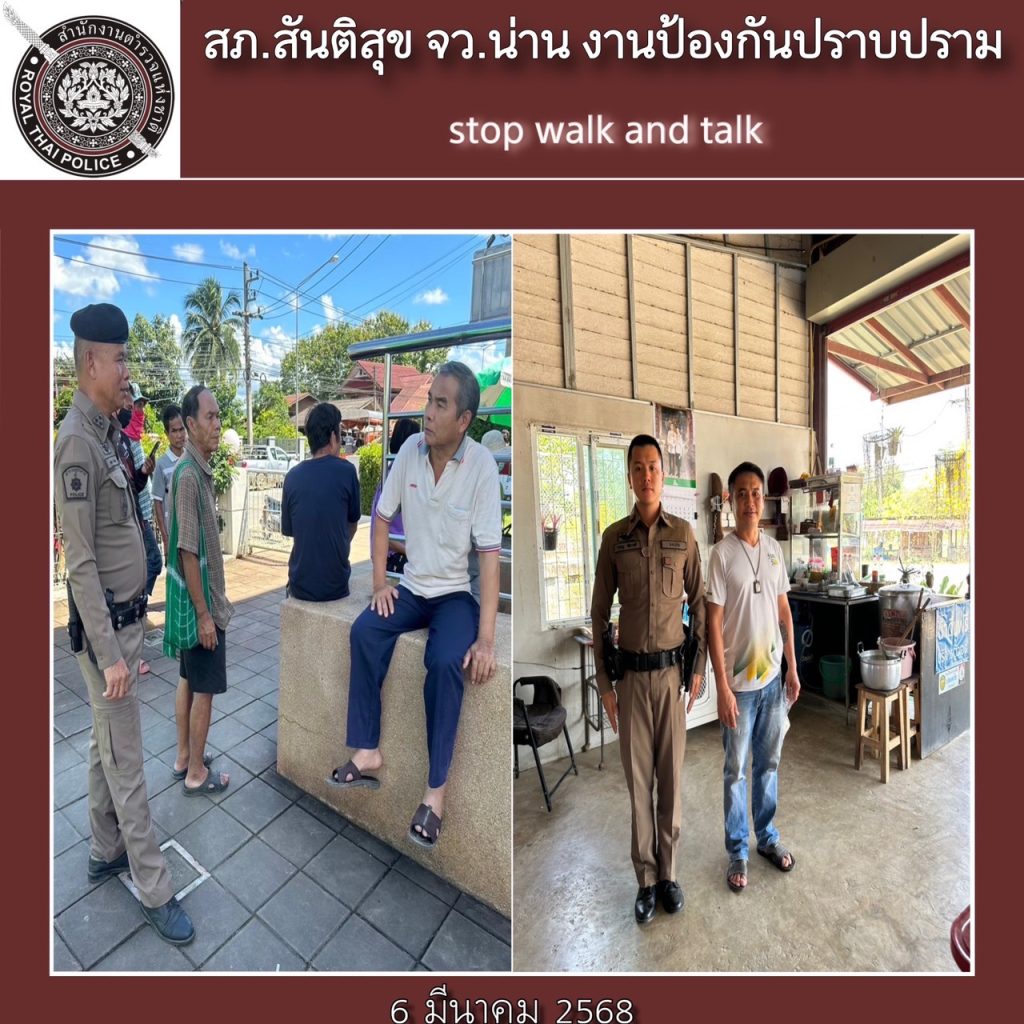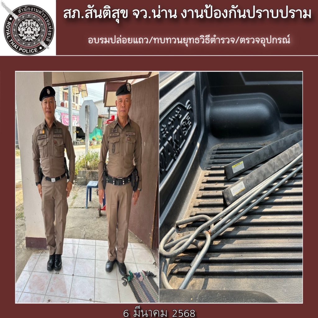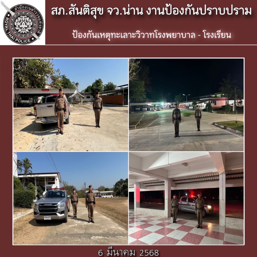 สภ.สันติสุข ภ.จว.น่าน วันที่ 6 มีนาคม 2568 โดยการอำนวยการของ พ.ต.อ.สมชาย กาวิเนตร ผกก.สภ.สันติสุข ฯ, พ.ต.ท.กรัยฉัตร อินต๊ะพันธ์ รอง ผกก.ป.ฯ, พ.ต.ต.สมพงษ์ ยั่งยืน สวป.ฯ ได้สั่งการให้ ร.ต.อ.อุทัย รินอินทร์ รอง สวป.ฯ/ปฏิบัติหน้าที่ร้อยเวรป้องกันปราบปราม(ร้อยเวร 20) พร้อมพวก * ขอรายงานผลการปฏิบัติตามมาตการ ป้องกันปราบปรามอาชญากรรม ภ.จว.น่าน ดังนี้