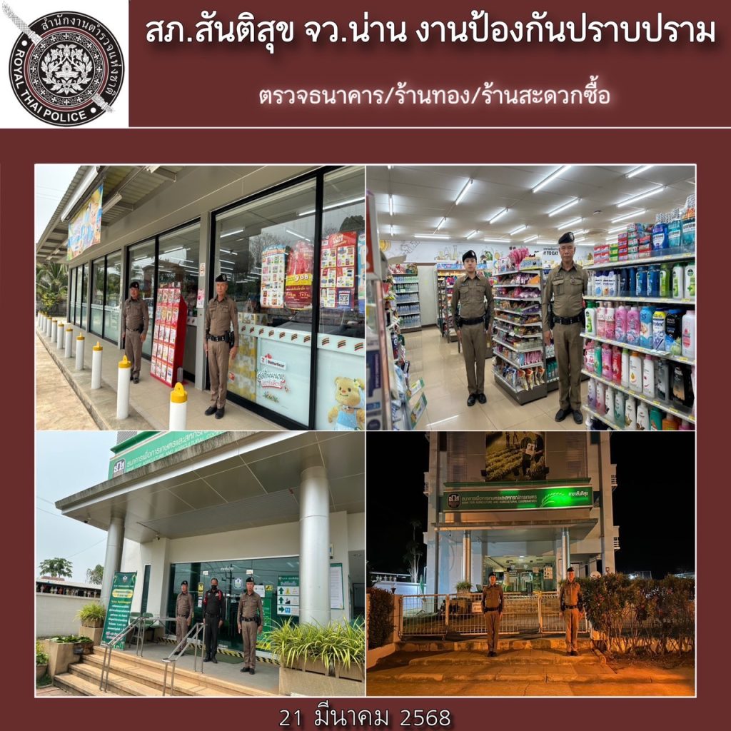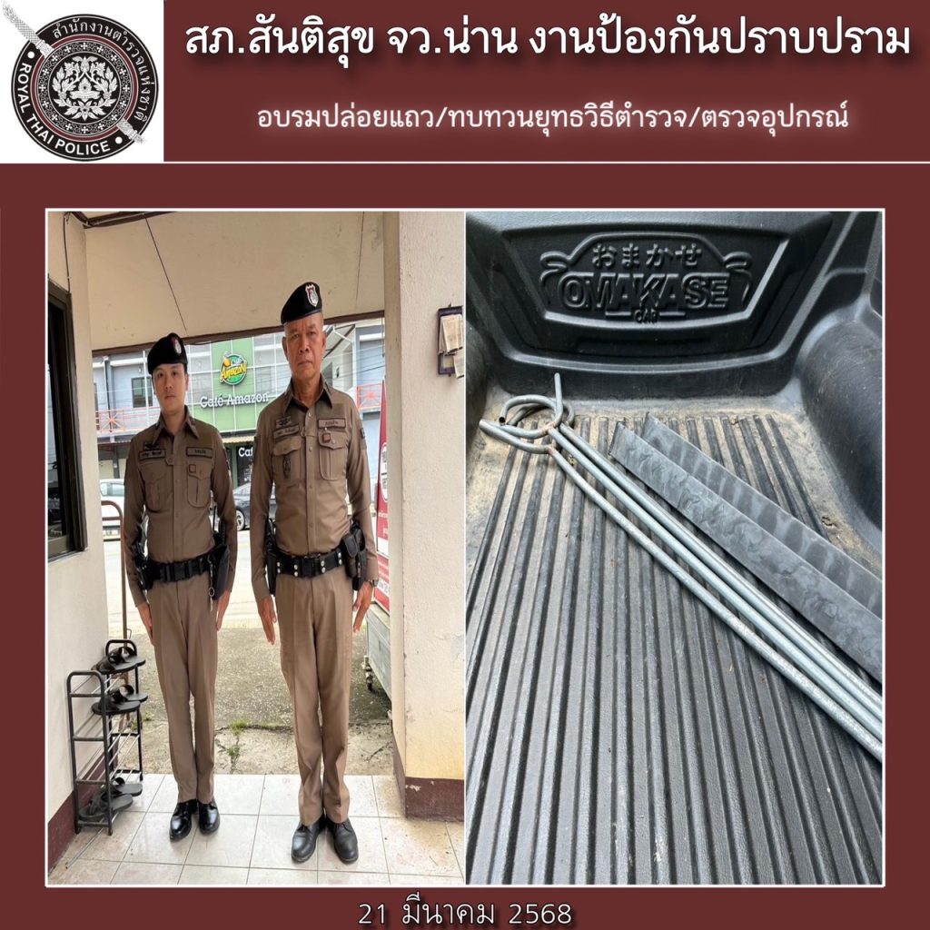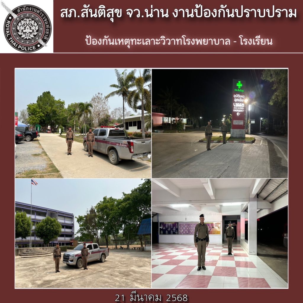 สภ.สันติสุข ภ.จว.น่าน เวลา 08.00 น.วันที่ 21 มีนาคม 2568 ถึง เวลา 08.00 น.วันท่ี่ 22 มีนาคม 2568 โดยการอำนวยการของ พ.ต.อ.สมชาย กาวิเนตร ผกก.ฯ พ.ต.ท.กรัยฉัตร อินต๊ะพันธ์ รอง ผกก.ป.ฯ พ.ต.ต.สมพงษ์ ยั่งยืน สวป.ฯ ได้สั่งการให้ ร.ต.อ.อุทัย รินอินทร์ รอง สวป.ฯ/ปฏิบัติหน้าที่ร้อยเวรป้องกันปราบปราม(ร้อยเวร 20) พร้อมพวก