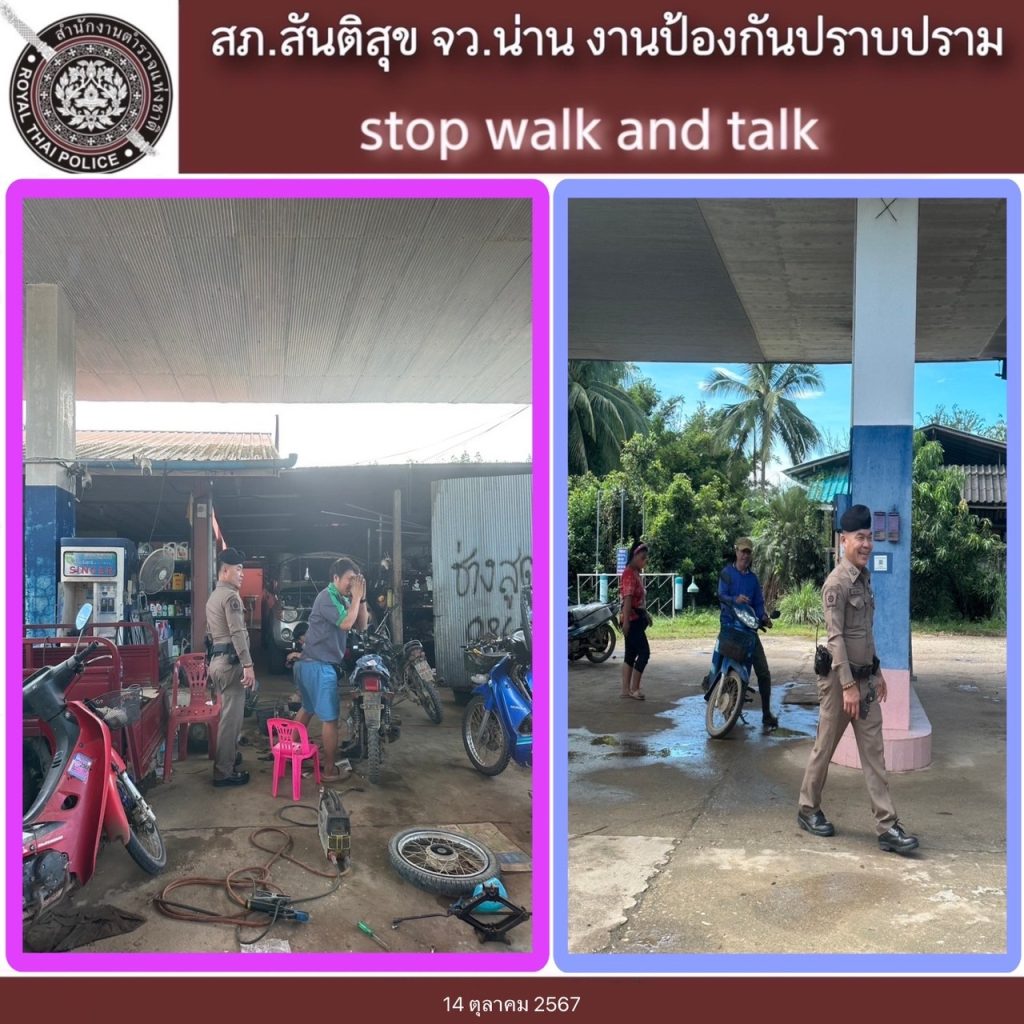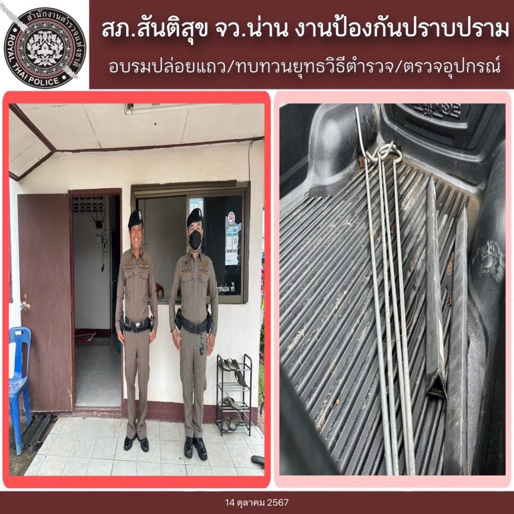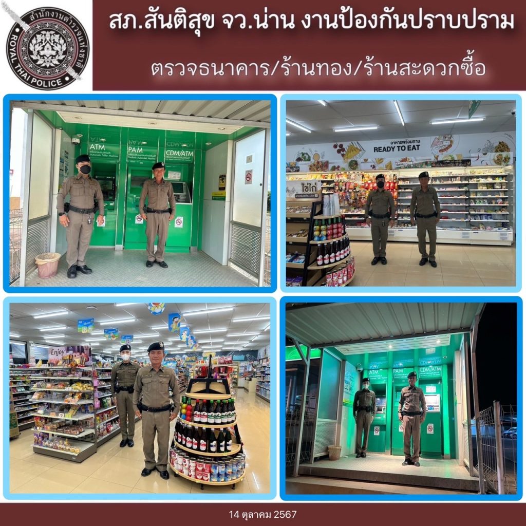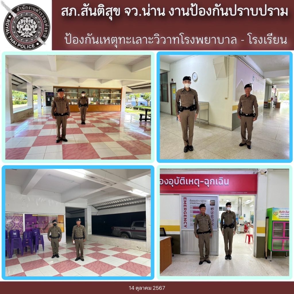 สภ.สันติสุข ภ.จว.น่าน วันที่ 14 ตุลาคม 2567 เวลา 08.00 น.ถึง 08.00 น. ของวันที่ 15 ตุลาคม 2567 โดยการอำนวยการของ พ.ต.อ.สมชาย กาวิเนตร ผกก.สภ.สันติสุข จว.น่าน, พ.ต.ท.เฉลิมเกียรติ ทำสุขรอง ผกก.ป.ฯ ,พ.ต.ต.สมพงษ์ ยั่งยืน สวป.ฯ ได้สั่งการให้ ร.ต.ท.พีระพล อิ่นติ๊บ รอง สว.(ป.)ฯ/ปฏิบัติหน้าที่ร้อยเวรป้องกันปราบปราม(ร้อยเวร 20) พร้อมพวก