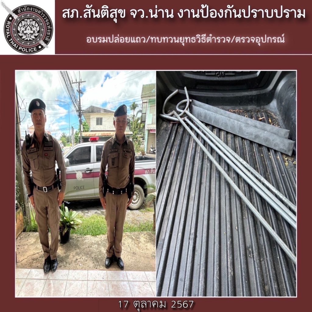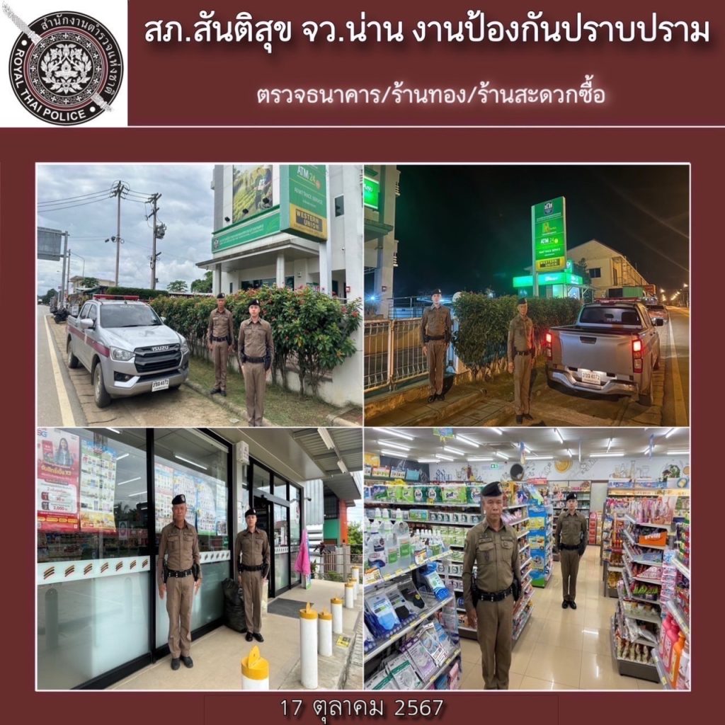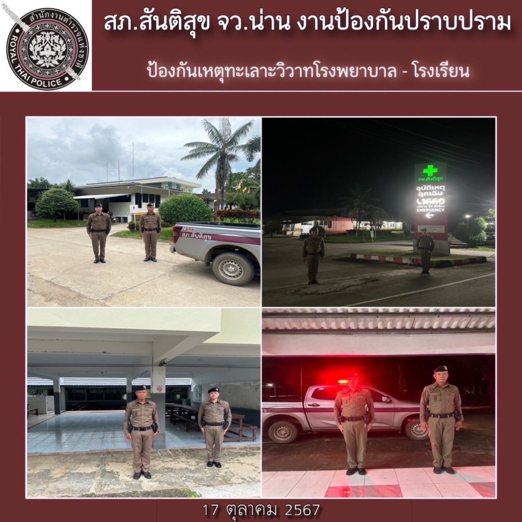 สภ.สันติสุข ภ.จว.น่าน วันที่ 17 ตุลาคม 2567 เวลา 08.00 น.ถึง 08.00 น. ของวันที่ 18 ตุลาคม 2567 โดยการอำนวยการของ พ.ต.อ.สมชาย กาวิเนตร ผกก.สภ.สันติสุข จว.น่าน, พ.ต.ท.เฉลิมเกียรติ ทำสุขรอง ผกก.ป.ฯ ,พ.ต.ต.สมพงษ์ ยั่งยืน สวป.ฯ ได้สั่งการให้ ร.ต.อ.อุทัย รินอินทร์ รอง สวป.ฯ/ปฏิบัติหน้าที่ร้อยเวรป้องกันปราบปราม(ร้อยเวร 20) พร้อมพวก