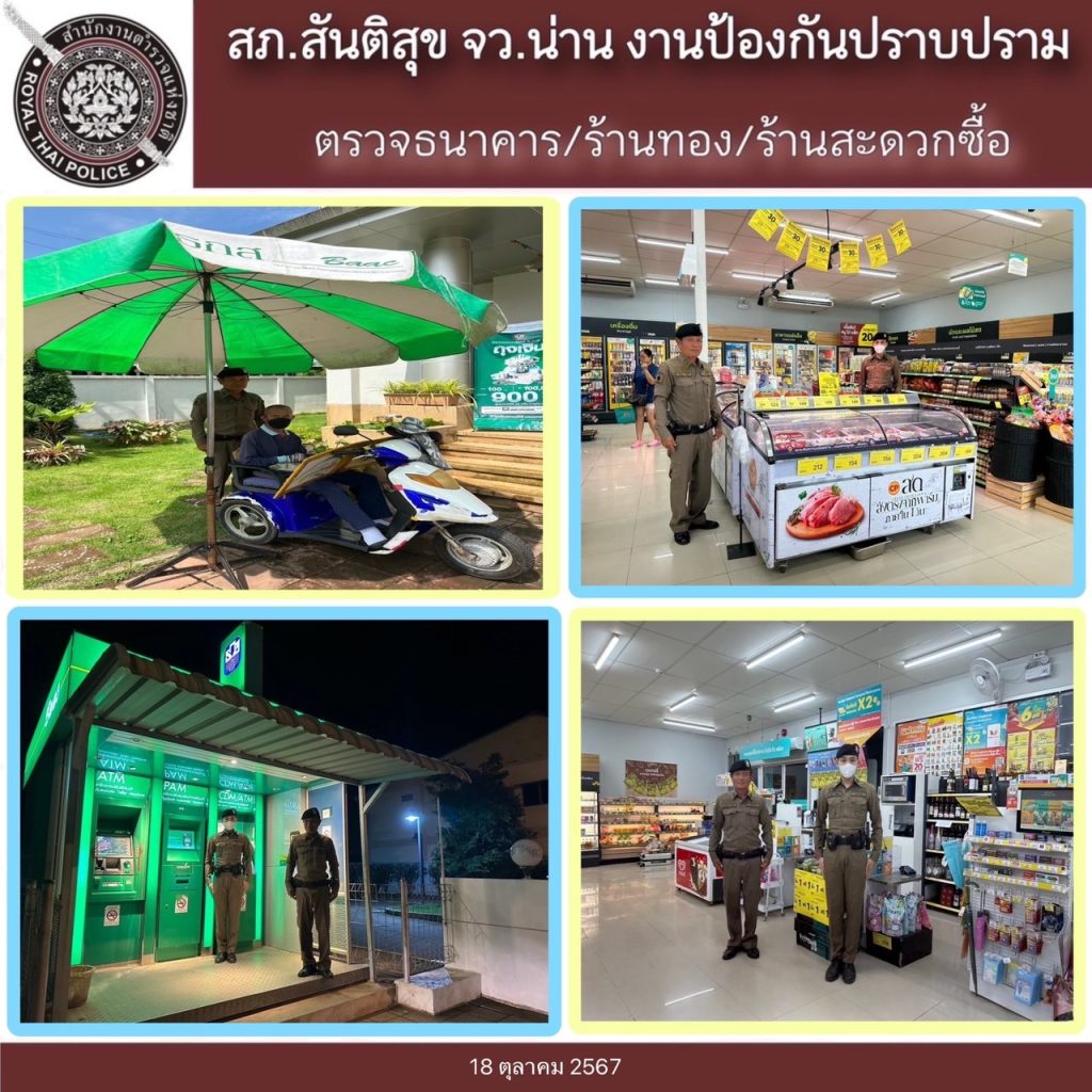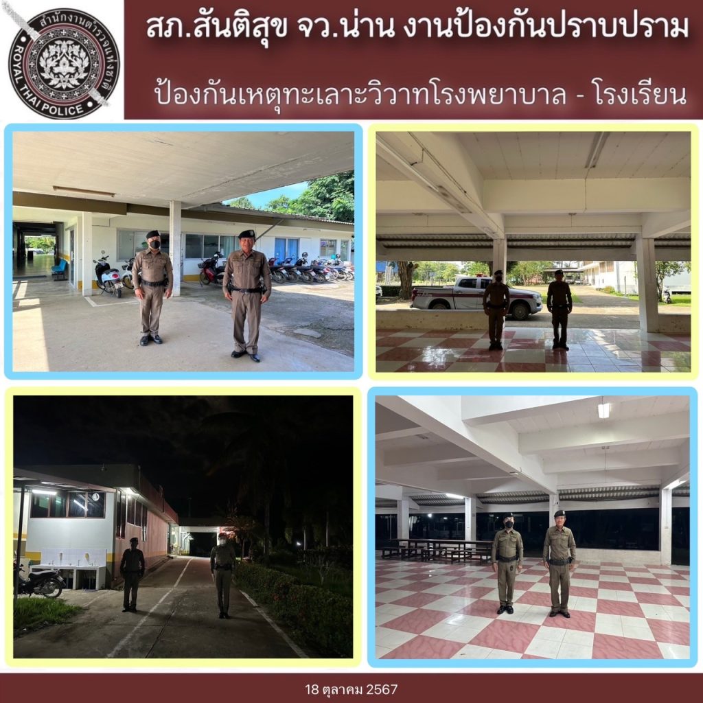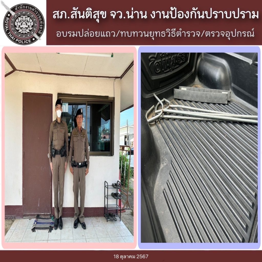 สภ.สันติสุข ภ.จว.น่าน วันที่ 18 ตุลาคม 2567 เวลา 08.00 น.ถึง 08.00 น. ของวันที่ 19 ตุลาคม 2567 โดยการอำนวยการของ พ.ต.อ.สมชาย กาวิเนตร ผกก.สภ.สันติสุข จว.น่าน, พ.ต.ท.เฉลิมเกียรติ ทำสุขรอง ผกก.ป.ฯ ,พ.ต.ต.สมพงษ์ ยั่งยืน สวป.ฯ ได้สั่งการให้ ร.ต.ท.พีระพล อิ่นติ๊บ รอง สว.(ป.)ฯ/ปฏิบัติหน้าที่ร้อยเวรป้องกันปราบปราม(ร้อยเวร 20) พร้อมพวก