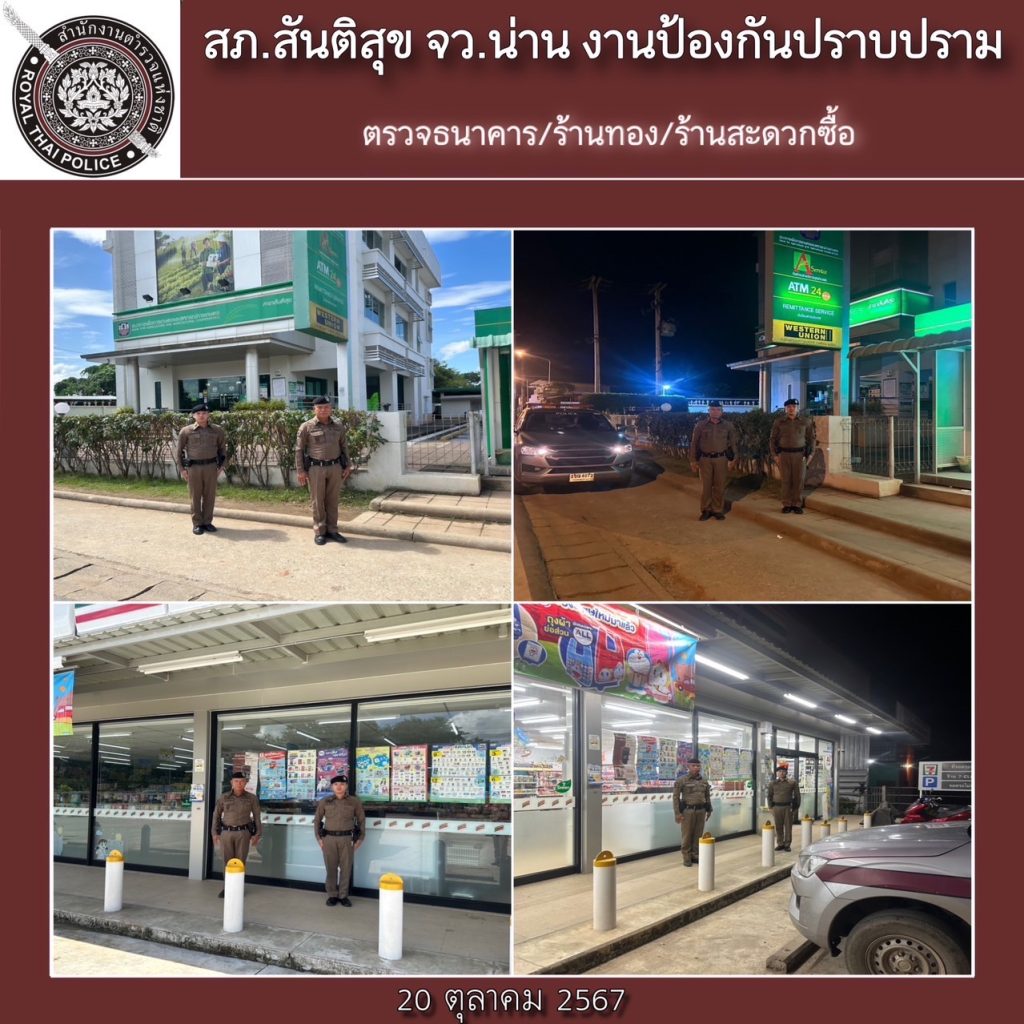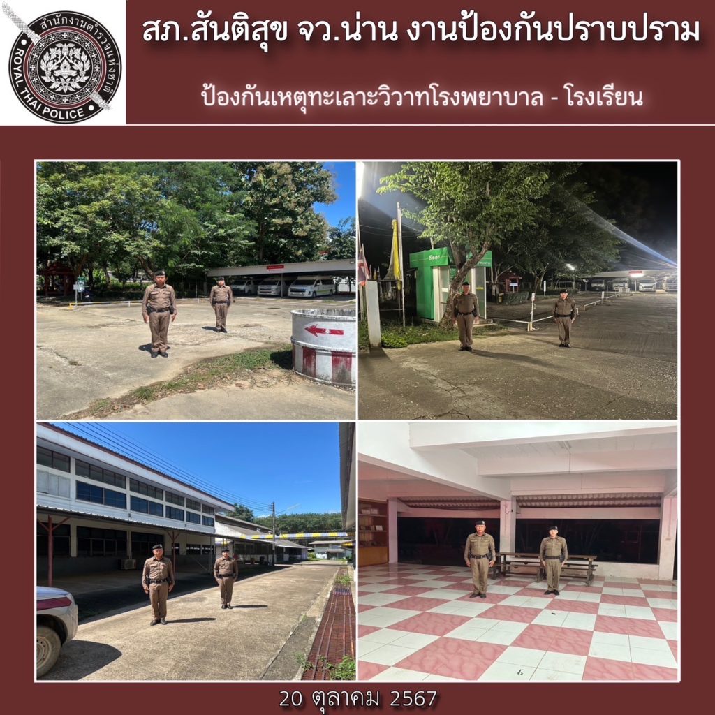 สภ.สันติสุข ภ.จว.น่าน วันที่ 20 ตุลาคม 2567 เวลา 08.00 น.ถึง 08.00 น. ของวันที่ 21 ตุลาคม 2567 โดยการอำนวยการของ พ.ต.อ.สมชาย กาวิเนตร ผกก.สภ.สันติสุข จว.น่าน, พ.ต.ท.เฉลิมเกียรติ ทำสุขรอง ผกก.ป.ฯ ,พ.ต.ต.สมพงษ์ ยั่งยืน สวป.ฯ ได้สั่งการให้ ร.ต.อ.อุทัย รินอินทร์ รอง สวป.ฯ ปฏิบัติหน้าที่ร้อยเวรป้องกันปราบปราม(ร้อยเวร 20) พร้อมพวก