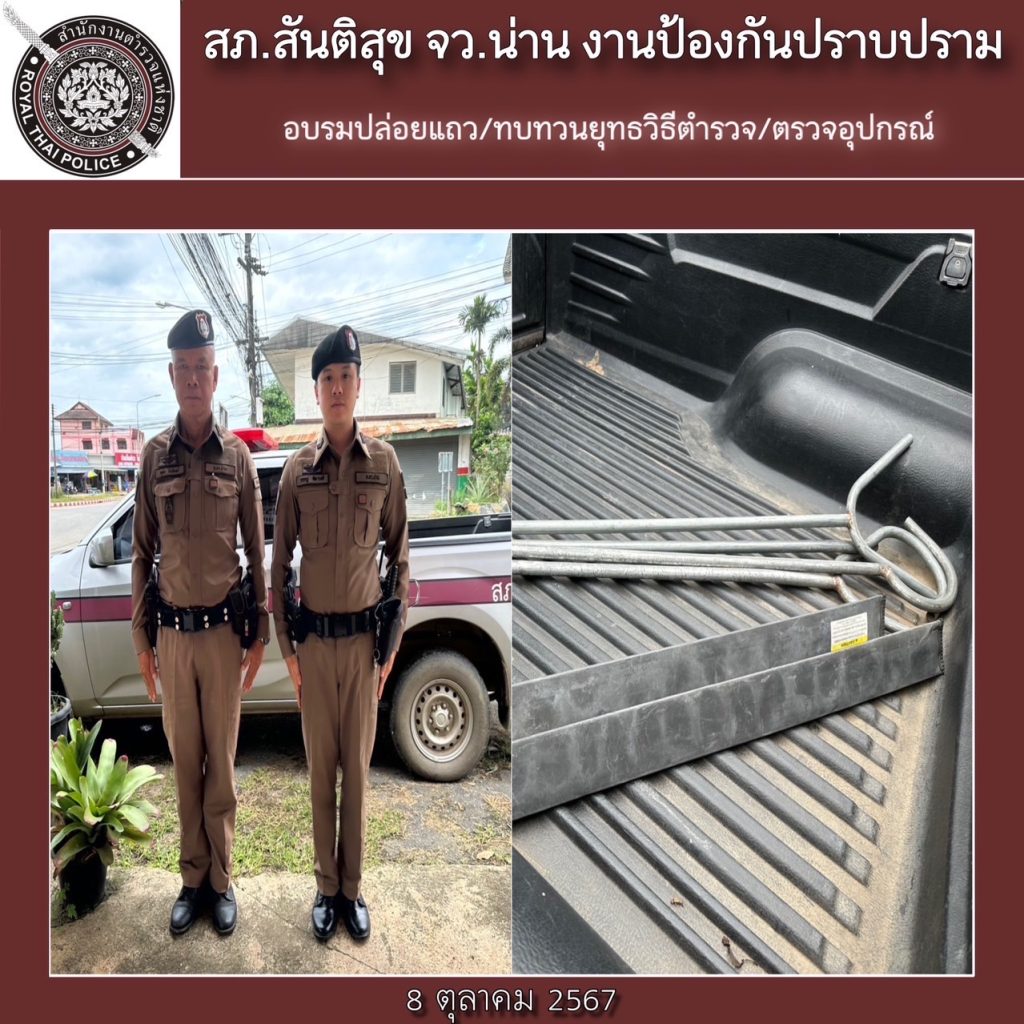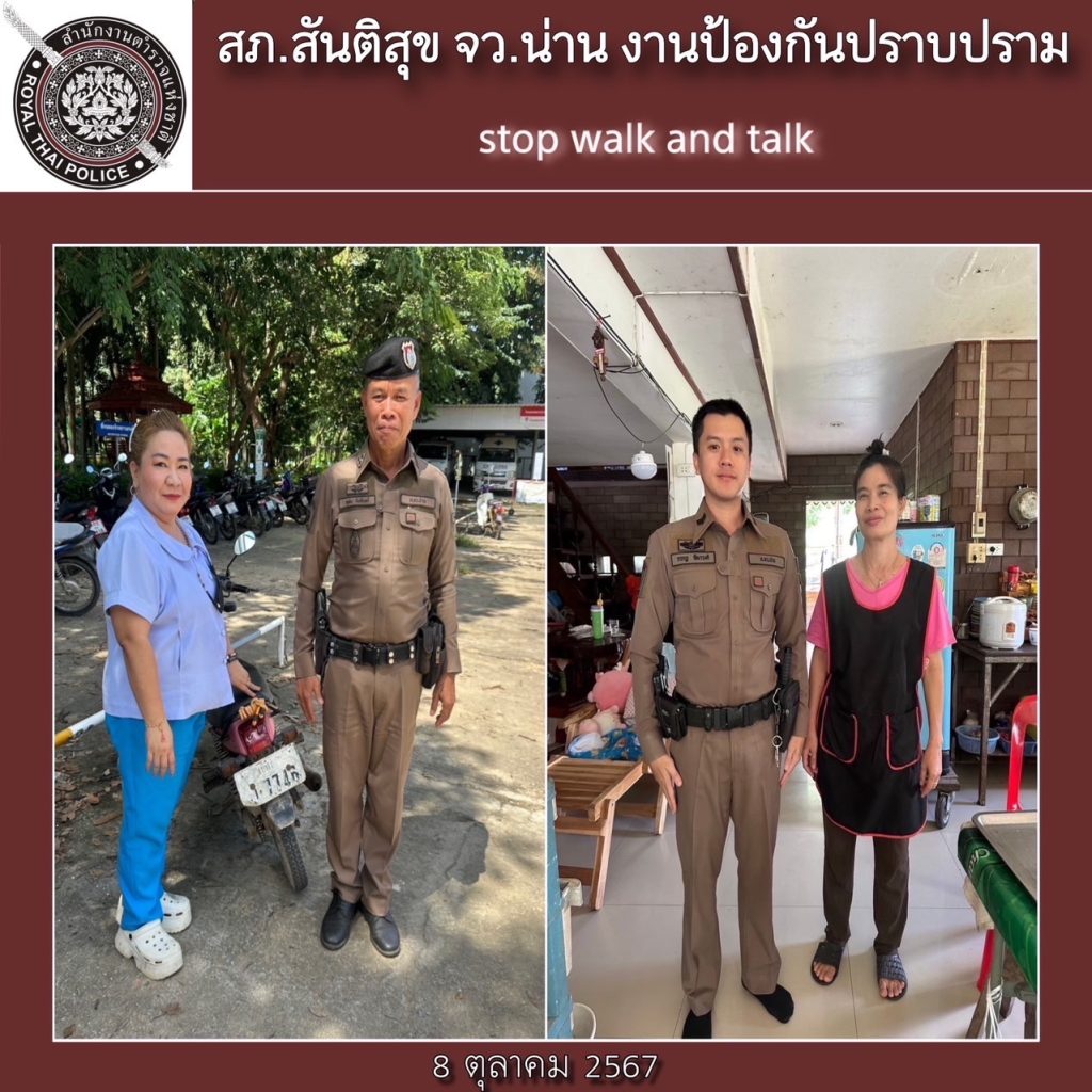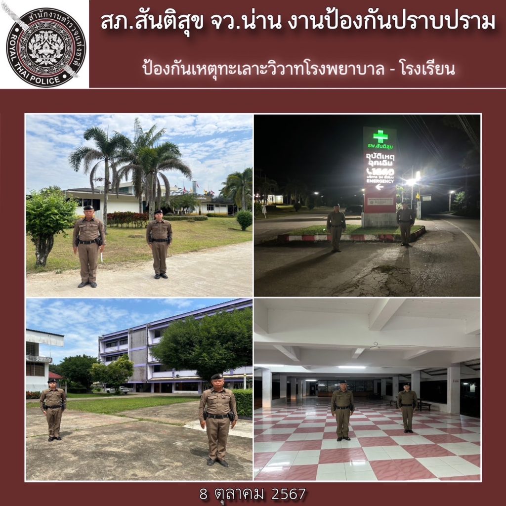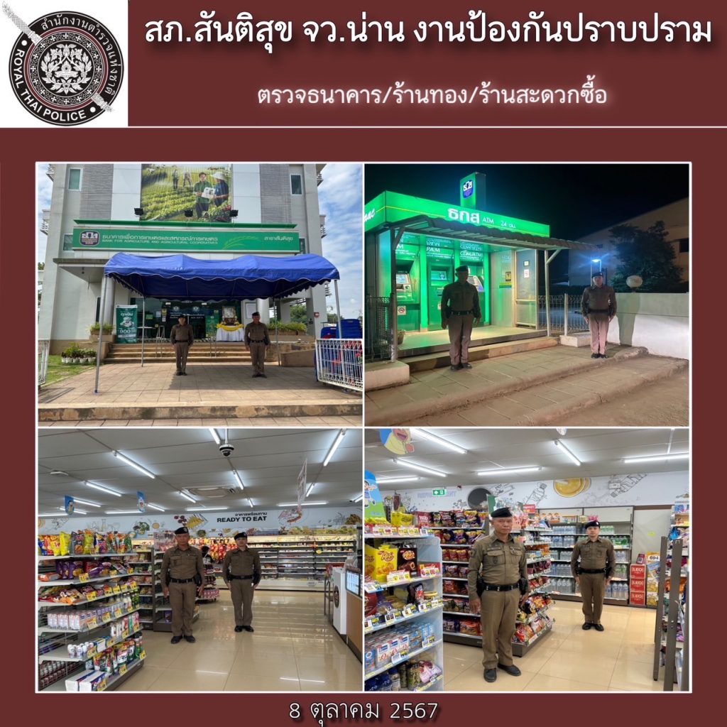 ร้อยเวร 20 ออกตรวจในพื้นที่รับผิดชอบ 9 ตุลาคม 2567 โดย admin / ข่าวประชาสัมพันธ์,งานป้องกันฯ( ต.ค.67) สภ.สันติสุข ภ.จว.น่านวันที่ 8 ตุลาคม 2567โดยการอำนวยการของพ.ต.อ.สมชาย กาวิเนตร ผกก.ฯ พ.ต.ท.เฉลิมเกียรติ ทำสุข รอง ผกก.ป.ฯ พ.ต.ต.สมพงษ์ ยั่งยืน สวป.ฯ ได้สั่งการให้ ร.ต.อ.อุทัย รินอินทร์ รอง สวป.ฯ/ปฏิบัติหน้าที่ร้อยเวรป้องกันปราบปราม(ร้อยเวร 20) พร้อมพวก * ขอรายงานผลการปฏิบัติตามมาตการ ป้องกันปราบปรามอาชญากรรม ภ.จว.น่าน ดังนี้1.การอบรมปล่อยแถวสายตรวจ ทบทวนยุทธวิธี ตรวจอุปกรณ์ประจำกาย อุปกรณ์ประจำรถ ก่อนออกปฏิบัติหน้าที่2.การตรวจ ธนาคาร -ร้านทองและตรวจตามโครงการ stop walk and talk3.การตั้งด่านตรวจ จุดตรวจ จุดสกัด เพื่อป้องกันปราบปรามอาชญากรรม,การแข่งรถในทางและความผิดอื่นที่เกี่ยวข้อง4.การตรวจ สถานบริการ สถานบันเทิง และ สถานที่ท่องเที่ยวที่สำคัญ5.ป้องกันเหตุทะเลาะวิวาทโรงพยาบาล – โรงเรียน