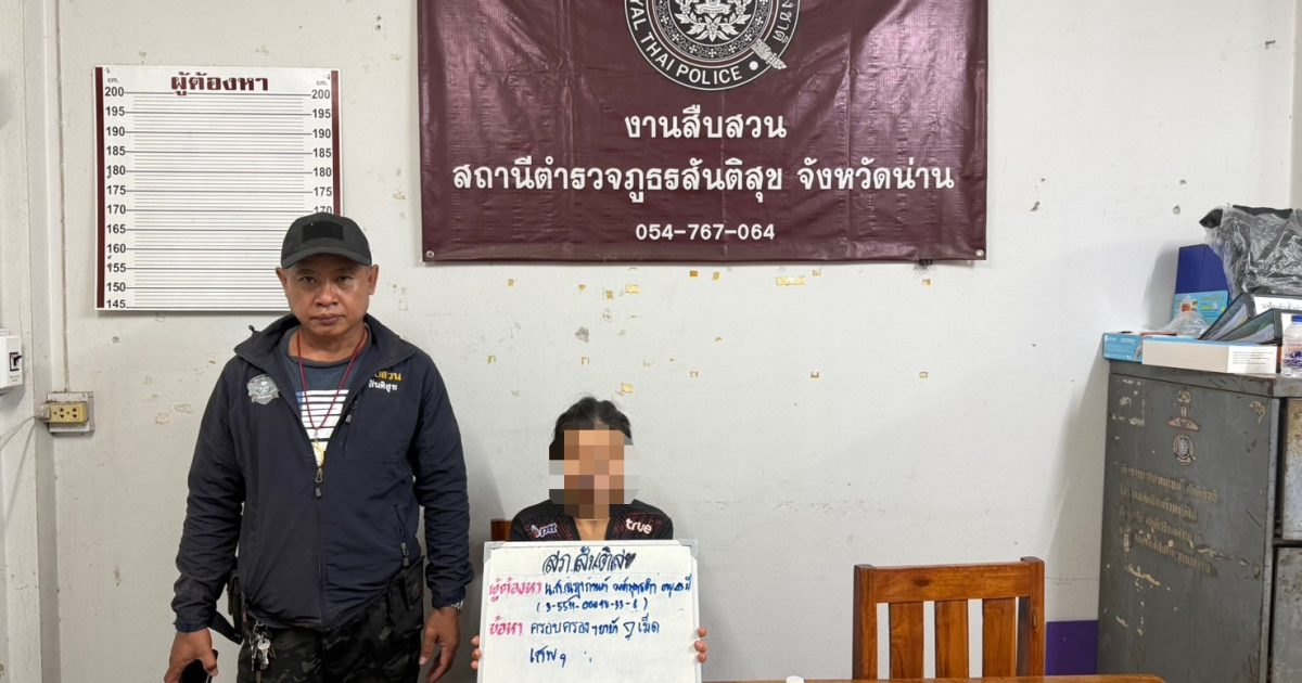 ตำรวจชุดจับกุมนำโดย พ.ต.ท.ชนาธิป ขันทะยศ สว.สส.ฯ ,ร.ต.อ.วัลลภ เขื่อนจันทร์ , ร.ต.อ.กานต์ดำรัส วงศ์สมานใจ ,ร.ต.ท.สุรพล ไชยอ้าย ,ส.ต.ท.นวภัทร สุทธิ ,ส.ต.ท.กันตพงศ์ สวนยศ ,จ.ส.ต.เอกมงคล ศรีรินติ๊บผู้ต้องหาชื่อ น.ส.ฉฎากานต์ วงค์พุทธคำ อายุ 43 ปี บ้านเลขที่ 102 หมู่ที่ 3 ตำบลป่าแลวหลวง อำเภอสันติสุข จังหวัดน่าน