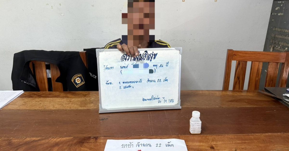 พร้อมด้วยของกลาง ลำดับที่ 1. ยาบ้าลักษณะเม็ดกลมแบนสีส้มแดง ด้านหนึ่งเรียบ อีกด้านหนึ่งประทับตราตัวอักษรภาษาอังกฤษWY จำนวน 22 เม็ด