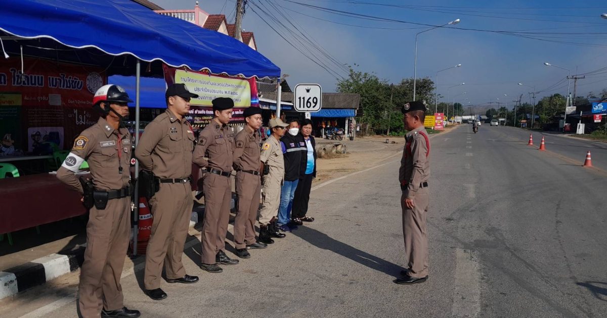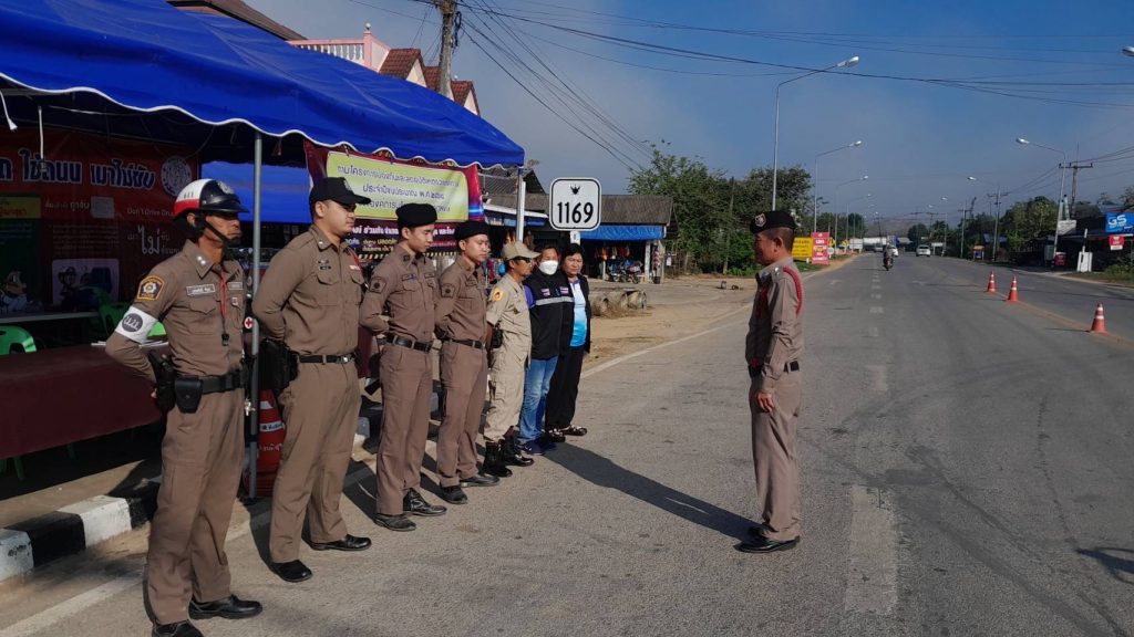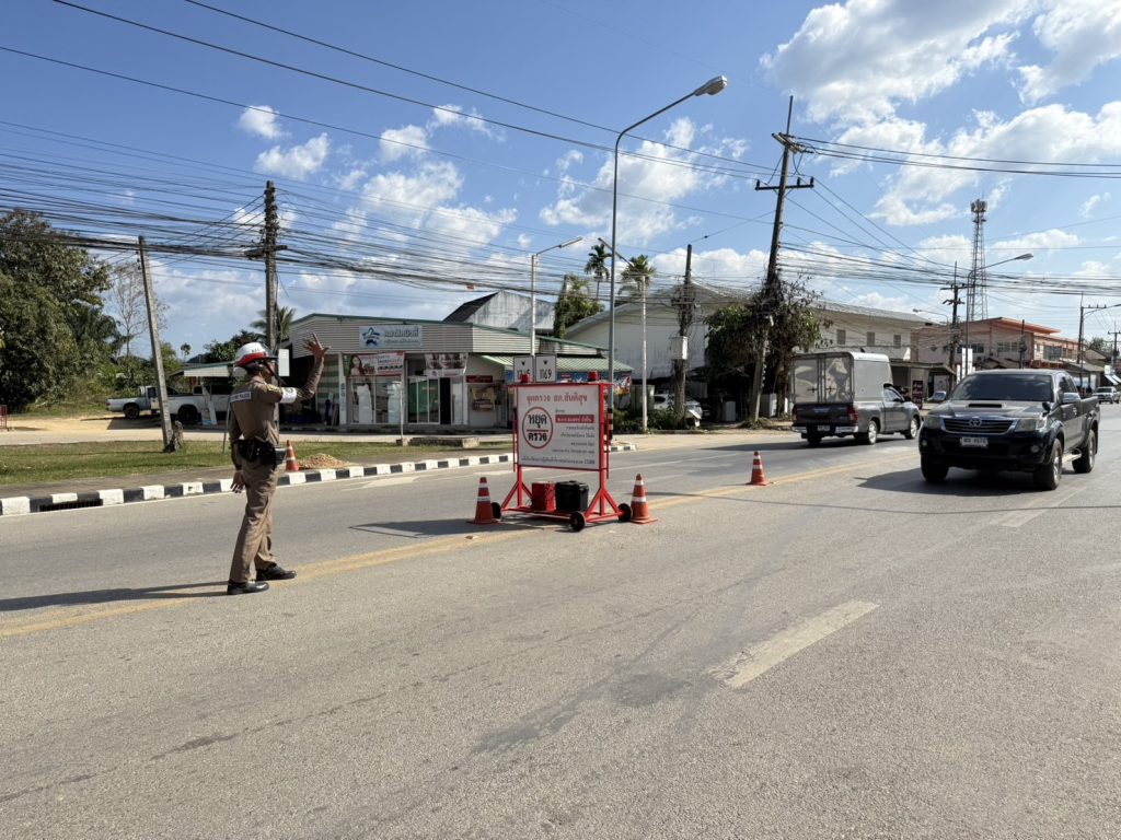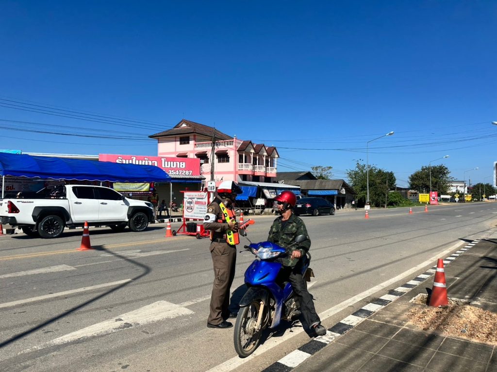 เจ้าหน้าที่ตำรวจประจำจุดตรวจบูรณาการห้วยปาได้ตั้งจุดตรวจกวดขันวินัยจราจร เพื่อบังคับใช้กฎหมายเพื่อ ป้องกันและลดอุบัติเหตุทางถนน ในช่วงเทศกาลปีใหม่ 2568