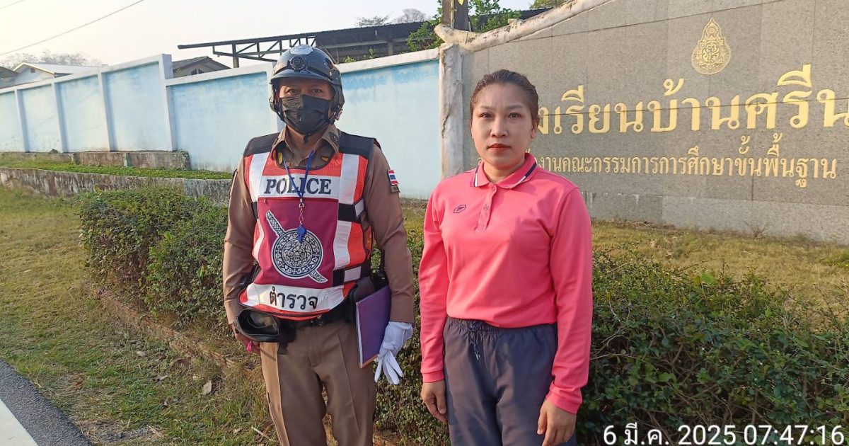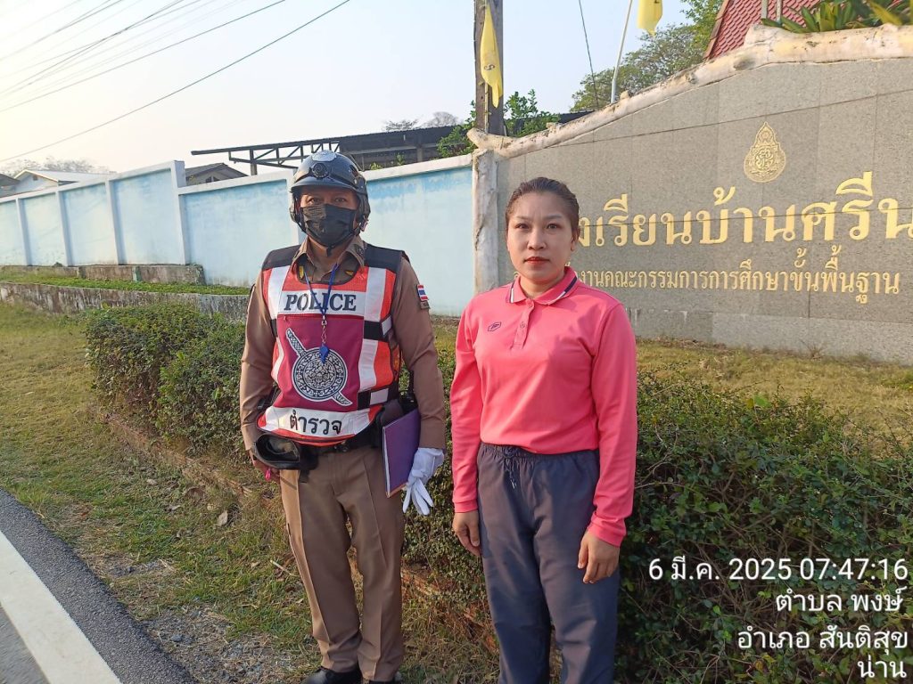 สภ.สันติสุข ภ.จว.น่าน วันที่ 6 มีนาคม 2568 เวลา 07.47 น. โดยการอำนวยการของ พ.ต.อ.สมชาย กาวิเนตร ผกก.สภ.สันติสุข ฯ ,พ.ต.ท.กรัยฉัตร อินต๊ะพันธ์ รอง ผกก.ป.ฯ ,พ.ต.ต.สมพงษ์ ยั่งยืน สวป.ฯได้มอบหมายให้ ร.ต.ต.นเรศ ทะภูมินทร์ รองสว.(ป.)สภ.สันติสุข จว.น่านปฏิบัติหน้าที่ประจำหน่วยบริการประชาชนกิ่วม่วงและเป็นเจ้าหน้าที่ตำรวจผู้รับผิดชอบโครงการประสานโรงเรียน 1 ตำรวจ 1 โรงเรียนได้ออกตรวจเยี่ยมพบปะครู-นักเรียนโรงเรียนบ้านศรีนาม่านได้รับการต้อนรับ จากนางญานิน อภิชาติสกุล ครูโรงเรียนบ้านศรีนาม่านได้พูดคุยสอบถามปรึกษาปัญหาต่างๆภายในโรงเรียนไม่พบว่ามีปัญหาแต่อย่างใด. ได้อำนวยความสะดวกด้านการจราจรหน้าโรงเรียนบ้านศรีนาม่าน จึงได้บันทึกภาพไว้เป็นหลักฐาน ในระหว่างออกตรวจเยี่ยมและอำนวยความสะดวกด้านการจราจรเหตุการณ์ทั่วไปปกติ ข้าฯจึงได้ออกตรวจในเขตพื้นที่รับผิดชอบต่อไป