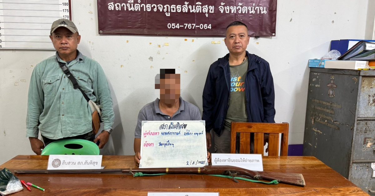 ลำดับที่ 1 วางพิงไว้บริเวณในกระท่อมไม่มีเลขที่ ที่นายสงกรานต์ฯ อาศัยอยู่ในขณะตรวจค้นวัน/เดือน/ปี ที่จับกุม 2 เมษายน 2569 เวลาประมาณ 17.00 น.สถานที่จับกุม กระท่อมไม่มีเลขที่ ท้ายหมู่บ้านน้ำโซ้ง หมู่ที่ 1 ตำบลดู่พงษ์ อำเภอสันติสุข จังหวัดน่านพฤติการณ์ในการจับกุม อ้างถึงคำสั่ง ภ.จว.น่าน ที่ 0020(นน).52/973 ลง 20 มี.ค.2569 เตรียมความพร้อมระดมกวาดล้างอาชญากรรมเป้าหมายอาวุธปืนและหมายจับ ห้วงวันที่ 24 มี.ค. – 5 เม.ย.69 วันนี้ 2 เมษายน 2569 เวลาประมาณ 16.00 น. เจ้าหน้าที่ตำรวจชุดจับกุมออกสืบสวนหาข่าวในพื้นที่รับผิดชอบ บริเวณบ้านน้ำโซ้งประกอบกับได้รับแจ้งจากสายลับ(สงวนชื่อ-นามสกุลเพื่อความปลอดภัย) ว่าบริเวณเขตทำกินท้ายหมู่บ้านมีบุคคลนอกพื้นที่ มาทำมาหากินและมีกลุ่มวัยรุ่นในพื้นที่ไปมั่วสุมบริเวณป่าท้ายหมู่บ้าน อาจเกิดอันตรายแก่ชุมชนและสังคม จึงแจ้งให้เจ้าหน้าที่ตำรวจไปตรวจสอบ เจ้าหน้าที่ตำรวจชุดสืบสวนจึงเดินทางไปตรวจสอบ จนกระทั่งถึงบริเวณกระท่อมไม่มีเลขที่หลังหนึ่ง พบชายลักษณะชายไทยชาวเขา ทราบชื่อภายหลังคือ นายสงกรานต์ แซ่ย่าง อาศัยอยู่บริเวณกระท่อมไม่มีเลขที่ดังกล่าว เจ้าหน้าที่ตำรวจจึง แสดงตัวพร้อมแจ้งให้ทราบว่าเป็นเจ้าหน้าที่ตำรวจ เจ้าพนักงาน ปปส. ของ พ.ต.ท.ชนาธิป ขันทะยศ สว.สส.สภ.สันติสุข จว.น่าน บัตรเลขที่ 6600993 และ เจ้าพนักงาน ปปส. ของ ร.ต.อ.กานต์ดำรัส วงศ์สมานใจ รอง สว.สส.สภ.สันติสุข จว.น่าน บัตรเลขที่ 6600996 เมื่อ นายสงกรานต์ฯ เห็นเจ้าหน้าที่ตำรวจ จึงที่ท่าทางมีพิรุธ เจ้าหน้าที่ตำรวจจึงได้แจ้งความประสงค์ขอทำการตรวจสอบตัวและบริเวณภายในกระท่อมไม่มีเลขที่ที่นายสงกรานต์ฯ อาศัยอยู่ โดยได้รับความยินยอมจาก นายสงกรานต์ฯ ก่อนทำการตรวจสอบได้แสดงความบริสุทธิ์ใจให้ นายสงกรานต์ฯ ดูจนเป็นที่พอใจแล้ว นายสงกรานต์ฯ ยินยอมให้เจ้าหน้าที่ตำรวจทำการตรวจค้น ผลการตรวจค้นตัว ไม่พบสิ่งของผิดกฎหมายแต่อย่างใด ผลการตรวจค้นภายในกระท่อมที่นายสงกรานต์อาศัยอยู่ พบ ของกลางลำดับที่ 1.อาวุธปืนยาวแบบประดิษฐ์เอง(ปืนแก๊ป) จำนวน 1 กระบอก วางพิงไว้บริเวณในกระท่อมไม่มีเลขที่ ที่นายสงกรานต์ฯ อาศัยอยู่ในขณะตรวจค้น และ นายสงกรานต์ฯ รับว่าอาวุธปืนที่เจ้าหน้าที่ชุดจับกุมค้นเจอเป็นของตนจริง เจ้าหน้าที่ตำรวจชุดจับกุมได้แจ้งให้ นายสงกรานต์ฯ ทราบว่าต้องถูกจับกุม พร้อมแจ้งข้อกล่าวหาว่า 1“ มีอาวุธปืนยาว(ปืนแก๊ป) ไว้ในครอบครองโดยไม่ได้รับอนุญาตจากนายทะเบียนท้องที่” เนื่องจากสถานที่ตามที่ได้รับแจ้งมีการแจ้งเกี่ยวกับบุคคลนอกพื้นที่และมั่วสุมเสพยาเสพติดจร