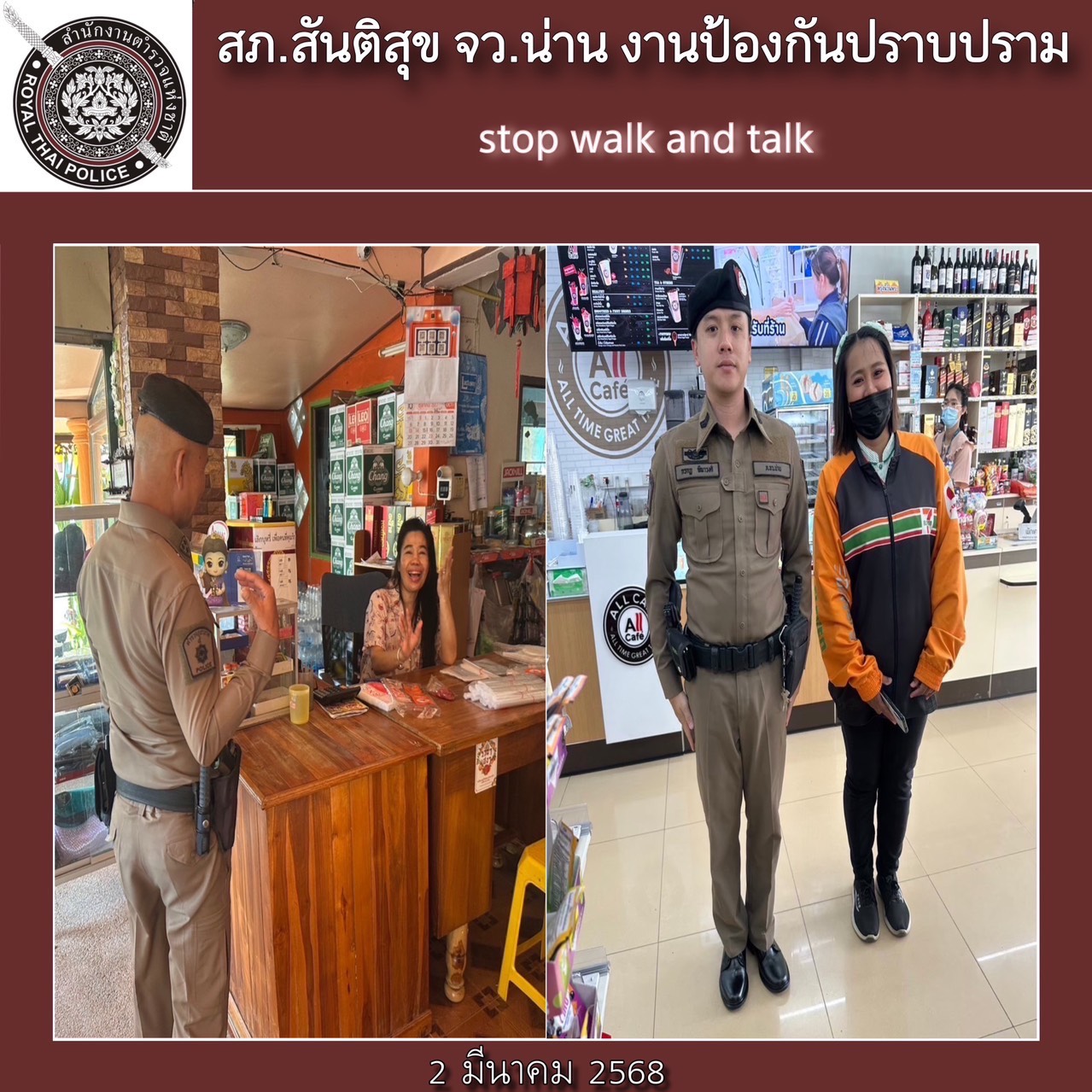 สภ.สันติสุข ภ.จว.น่าน วันที่ 2 มีนาคม 2568 เวลา 08.30 น. โดยการอำนวยการของพ.ต.อ.สมชาย กาวิเนตร ผกก.ฯ