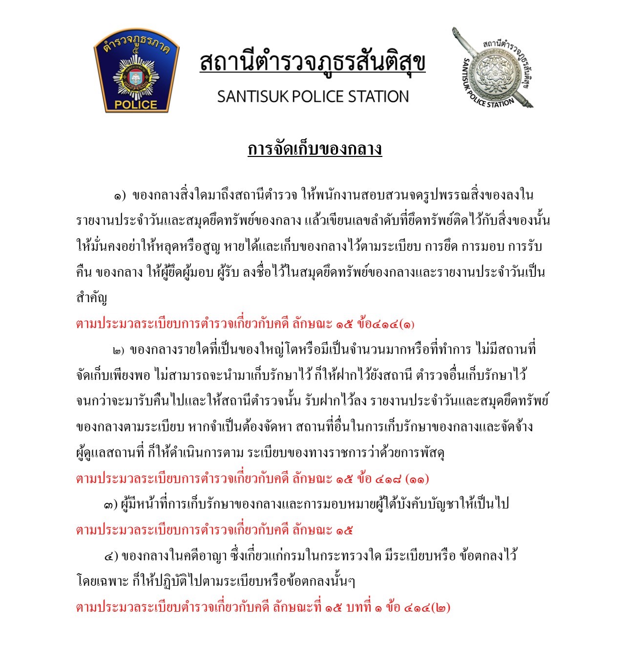 ประกาศสถานีตำรวจภูธรสันติสุข จังหวัดน่าน เรื่อง การจัดการทรัพย์สินของราชการ ของบริจาค และการจัดเก็บของกลางและสำนวนการสอบสวนคดีอาญาและคดีจราจร