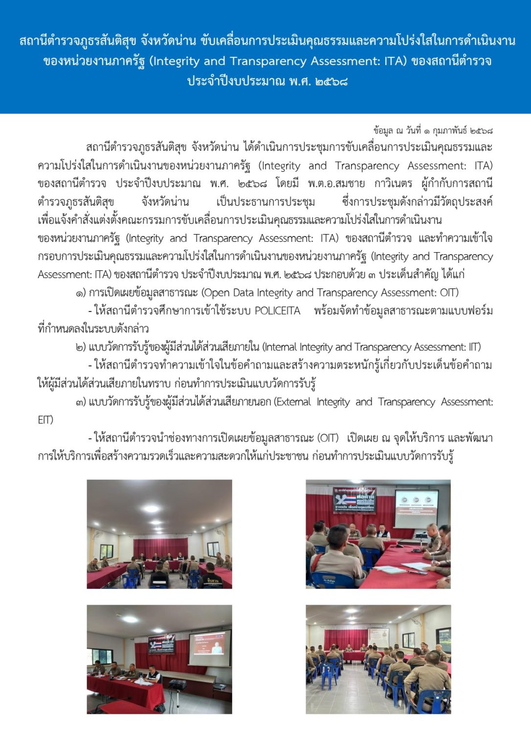 พ.ต.อ.สมชาย กาวิเนตร ผกก.สภ.สันติสุข จว.น่าน เป็นประธานประชุมชี้แจงการขับเคลื่อนการประเมิน ตาม ITA ประจำปีงบประมาณ พ.ศ.2568 และประชุมชี้แจงนโยบายของผู้บังคับบัญชา ฯ
